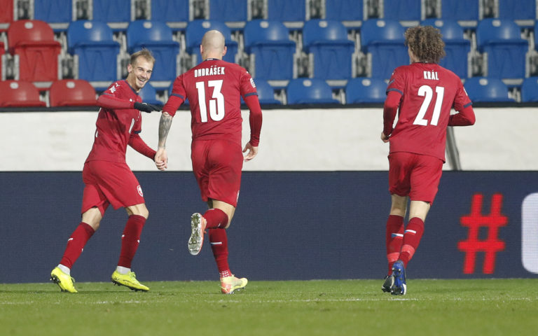 Český reprezentant Zdeněk Ondrášek sa so spoluhráčmi teší z gólu v sieti Slovenska počas zápasu 2. skupiny B-divízie Ligy národov. Plzeň (Doosan Arena), 18. november 2020. Foto: SITA/AP.
