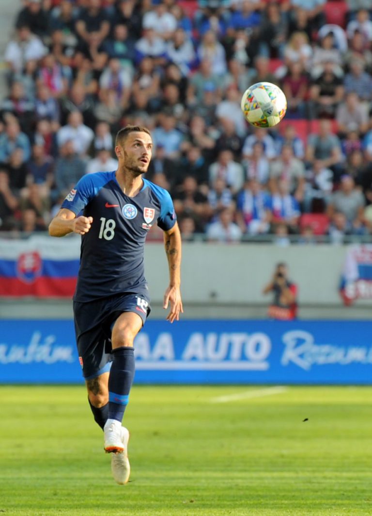 Erik Sabo zo Slovenska počas 3. kola futbalového zápasu 1. skupiny B-divízie európskej Ligy národov 2018/2019 medzi Slovensko - Česko. Trnava, 13. október 2018. Foto: SITA/Martin Havran