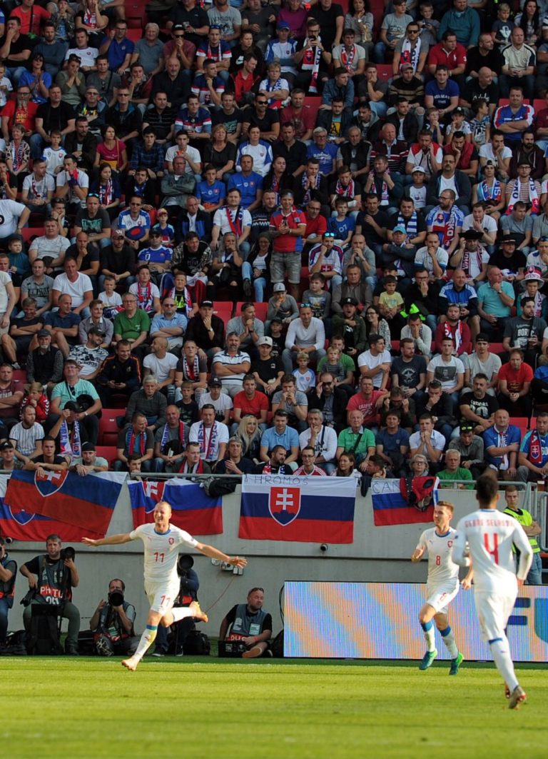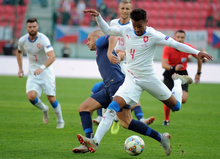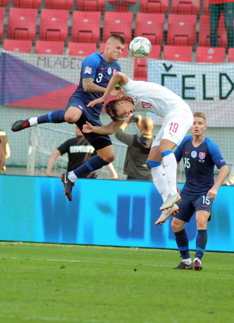 Michael Krmenčík z Českej Republiky (vľavo) počas 3. kola futbalového zápasu 1. skupiny B-divízie európskej Ligy národov 2018/2019 medzi Slovensko - Česko. Trnava, 13. október 2018. Foto: SITA/Martin Havran