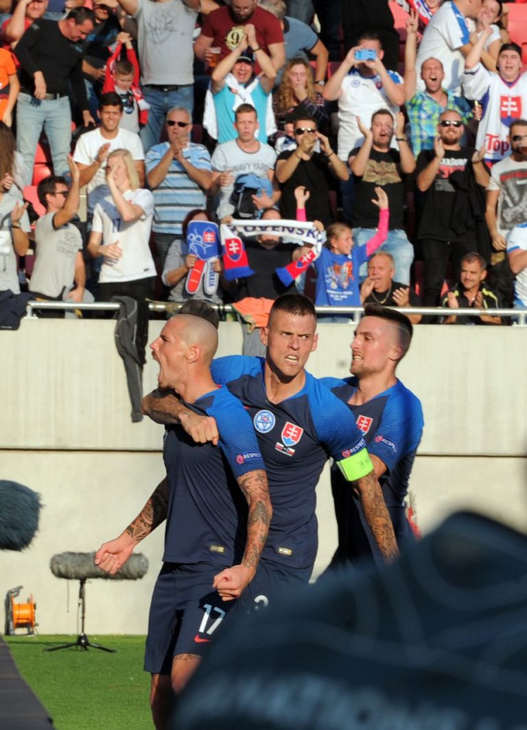 Zľava: Marek Hamšík, Martin Škrteľ a Róbert Mak, všetci zo Slovenska počas 3. kola futbalového zápasu 1. skupiny B-divízie európskej Ligy národov 2018/2019 medzi Slovensko - Česko. Trnava, 13. október 2018. Foto: SITA/Martin Havran