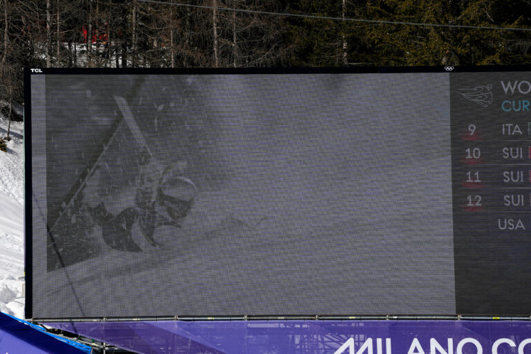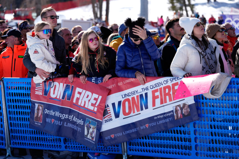 Fanúšikovia v cieli zjazdu žien po páde americkej lyžiarky Lindsey Vonnovej. Cortina d'Ampezzo, 8. február 2026. Foto: SITA/AP