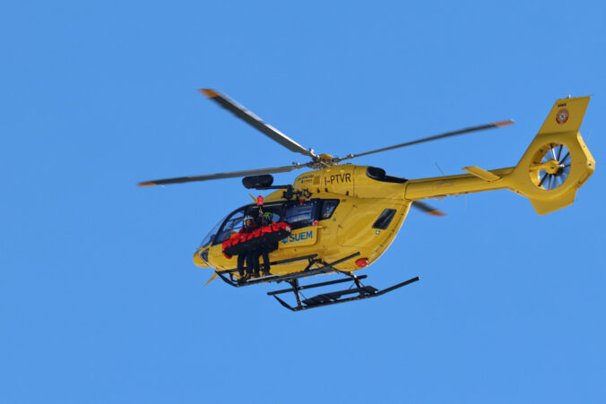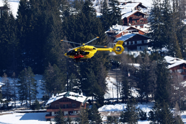 Americkú lyžiarku Lindsey Vonnovú po páde zo zjazdovky Olimpia delle Tofane odvážal vrtuľník. Cortina d'Ampezzo, 8. február 2026. Foto: SITA/AP.