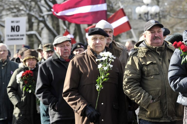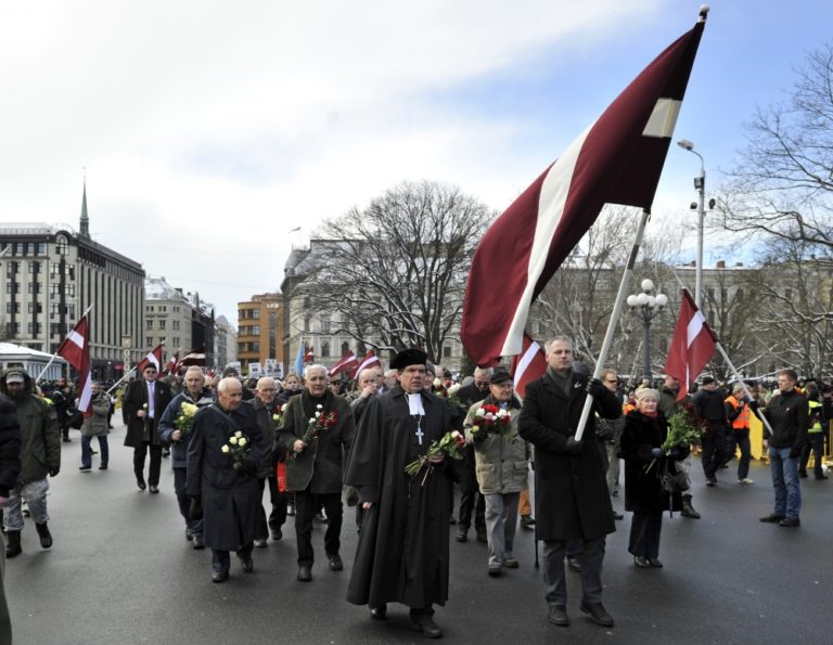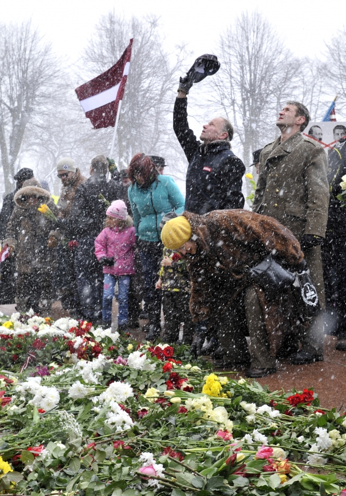 Asi 1500 Lotyšov sa v nedeľu zúčastnilo na pochode v rámci Dňa legionárov, ktorý oslavuje vojnových veteránov z tamojších nacistických divízií Waffen SS. Účastníci za dozoru polície pochodovali k Pamätníku slobody v Rige. Riga, 16. marca 2014.
