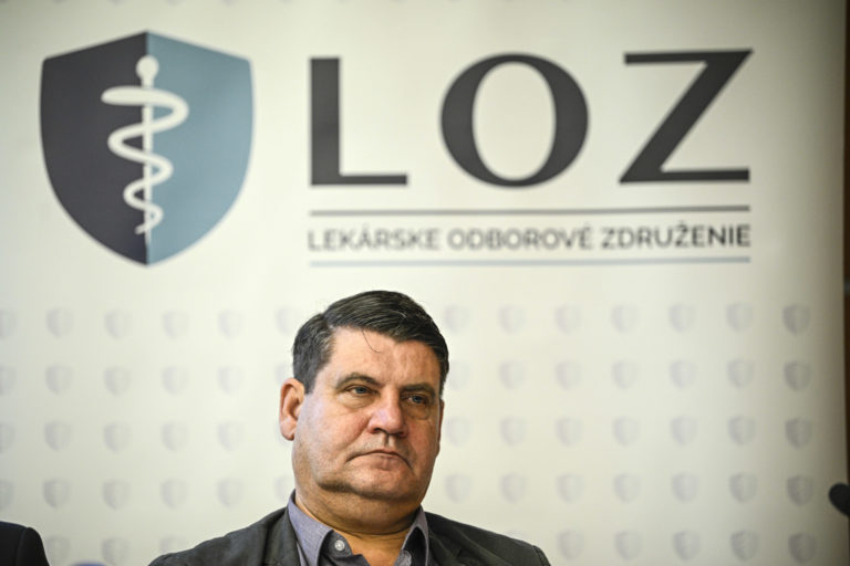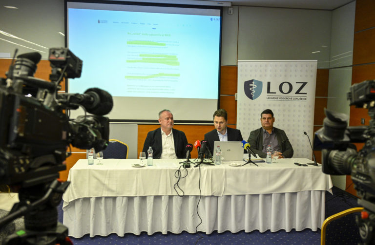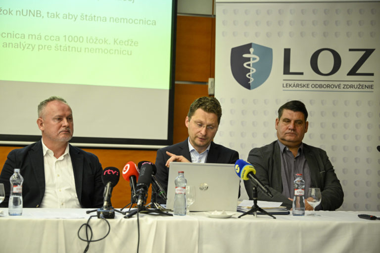 Zľava: Podpredseda Lekárskeho odborového združenia (LOZ) Ján Sýkora, predseda LOZ Peter Visolajsky a predseda LOZ - Kramáre Zoltán Jány počas tlačovej besedy Lekárskeho odborového združenia na tému: Analýza za štátne peniaze, ktorej výsledok sa verejnosť nemá dozvedieť. Bratislava, 12. január 2024. Foto: archívne, SITA/Milan Illík