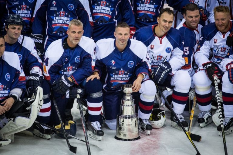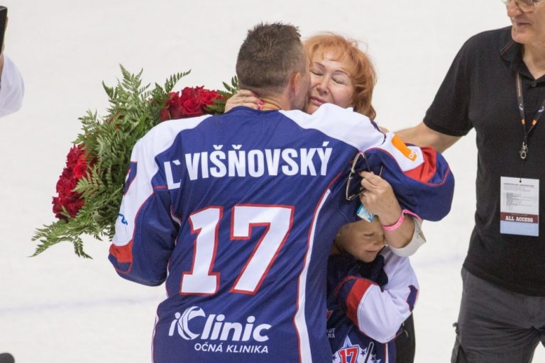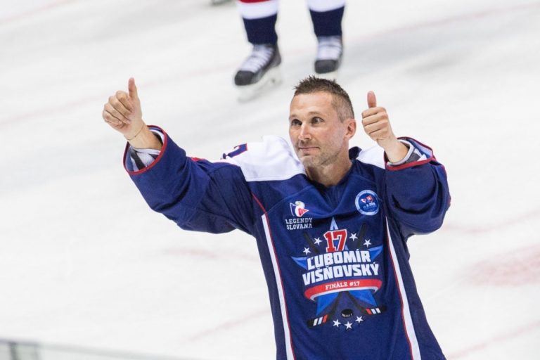 Hokejista Ľubomír Višňovský počas lúčenia po skončení exhibičného zápasu s názvom Finále 17: Legendy Slovana vs Zlatí Chlapci. Bratislava, 11. august 2016. Foto: SITA/Marko Erd