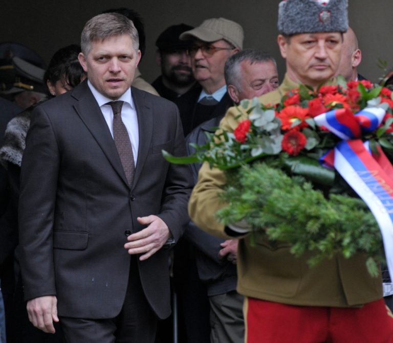 Predseda vlády SR Robert Fico (vľavo) pri príležitosti 96. výročia tragickej smrti gen. M. R. Štefánika položil veniec k soche na nádvorí jeho rodného domu. Košariská, okr. Myjava, 3. máj 2015. Foto: SITA/Martin Medňanský