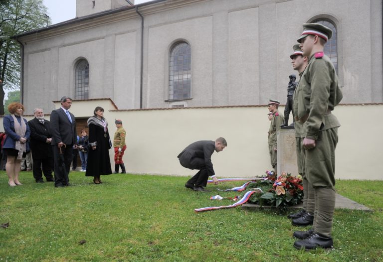 Predseda vlády SR Robert Fico (tretí zľava) pri príležitosti 96. výročia tragickej smrti gen. M. R. Štefánika položil veniec k soche na nádvorí jeho rodného domu. Košariská, okr. Myjava, 3. máj 2015. Foto: SITA/Martin Medňanský