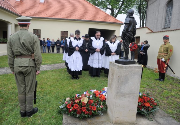 Zástupcovia cirkví pri príležitosti 96. výročia tragickej smrti generála Milana Rastislava Štefánika. Na snímke: Senior Myjavského seniorátu Miroslav Hvožďara (druhý zľava), biskup ZD ECAV (tretí zľava) Milan Krivda. Košariská, okr. Myjava, 3. máj 2015. Foto: SITA/Martin Medňanský