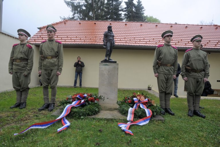 Pri soche Štefánika stojí čestná stráž v uniforme Československých légií počas pietnej spomienka pri príležitosti 96. výročia tragickej smrti gen. M. R. Štefánika. Košariská, okr. Myjava, 3. máj 2015. Foto: SITA/Martin Medňanský