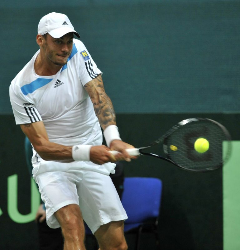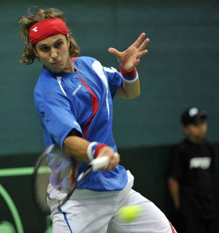 Slovenská jednotka Lukáš Lacko počas zápasu proti dvojke hostí Andreasovi Haider-Maurerovi v stretnutí 2. kola I. skupiny euroafrickej zóny Davisovho pohára Slovensko - Rakúsko. Bratislava, 4. apríl 2014. Foto: SITA/Ján Slovák