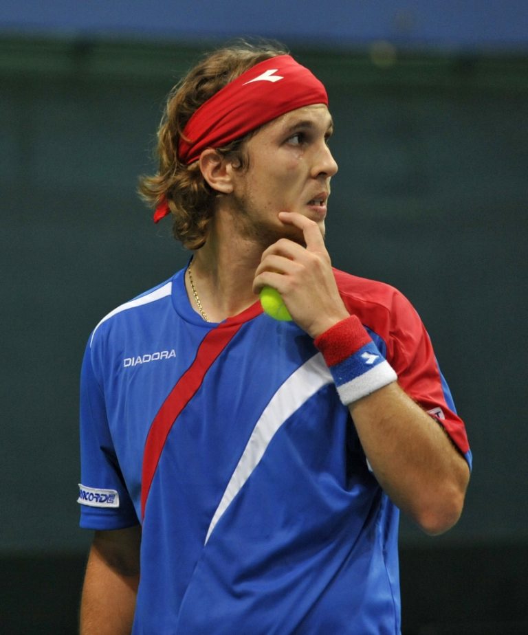 Rakúska jednotka Andreas Haider-Maurer počas zápasu proti slovenskej jednotke Lukášovi Lackovi v stretnutí 2. kola I. skupiny euroafrickej zóny Davisovho pohára Slovensko - Rakúsko. Bratislava, 4. apríl 2014. Foto: SITA/Ján Slovák