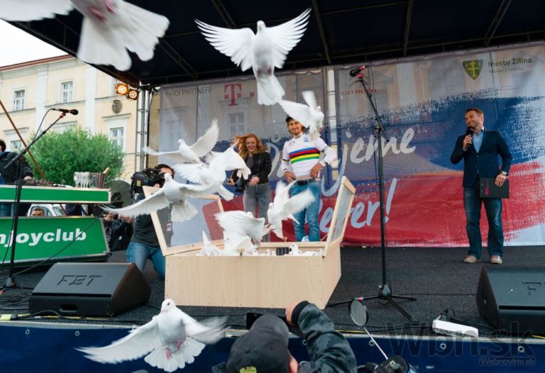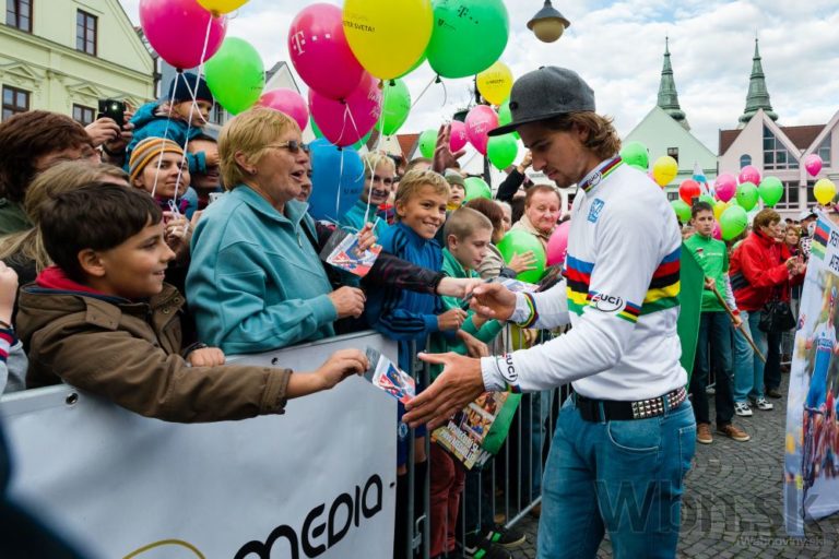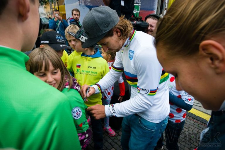 Majster sveta v cestnej cyklistike v kategórii elite Peter Sagan (uprostred) počas vystúpenia na Mariánskom námestí v Žiline v rámci podujatia "Vitaj Peťo". Žilina, 30. september 2015. Foto: SITA/Milo Fabian