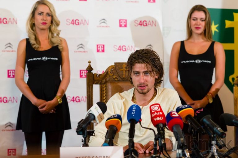 Sprava: Generálny riaditeľ PSA Matúš Paľa, výkonný riaditeľ pre mass market segment Slovak Telekom Dušan Švalek a majster sveta v cestnej cyklistike v kategórii elite Peter Sagan počas tlačovej konferencie na žilinskej radnici. Žilina, 30. september 2015. Foto: SITA/Milo Fabian