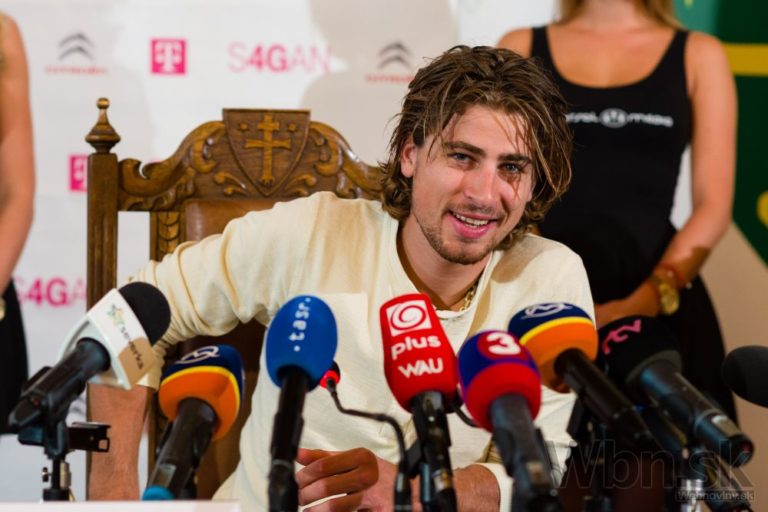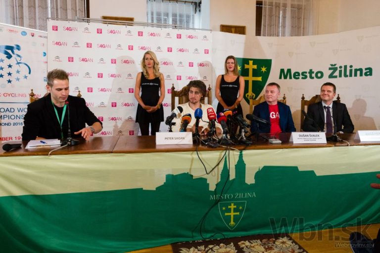 Cyklista Peter Sagan (uprostred), majster sveta v cestnej cyklistike v kategórii elite, počas tlačovej konferencie na žilinskej radnici. Žilina, 30. september 2015. Foto: SITA/Milo Fabian