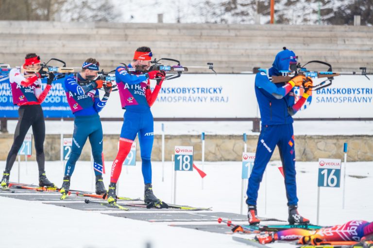 Slovenský biatlonista Tomáš Sklenárik (druhý sprava) počas oficiálneho tréningu pred začatím vytrvalostných pretekov mužov na 20 km v rámci majstrovstiev Európy v biatlone 2024 v Osrblí. Brezno-Osrblie, 24. január 2024. Foto: SITA/Igor Stančík/Slovenský biatlon.
