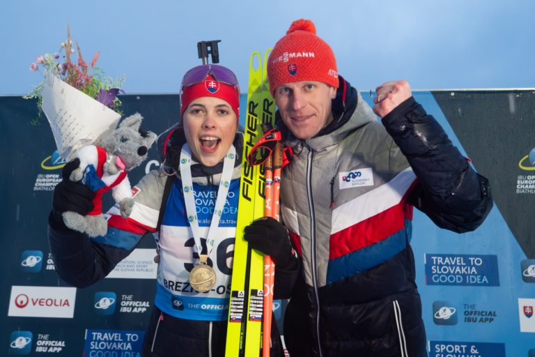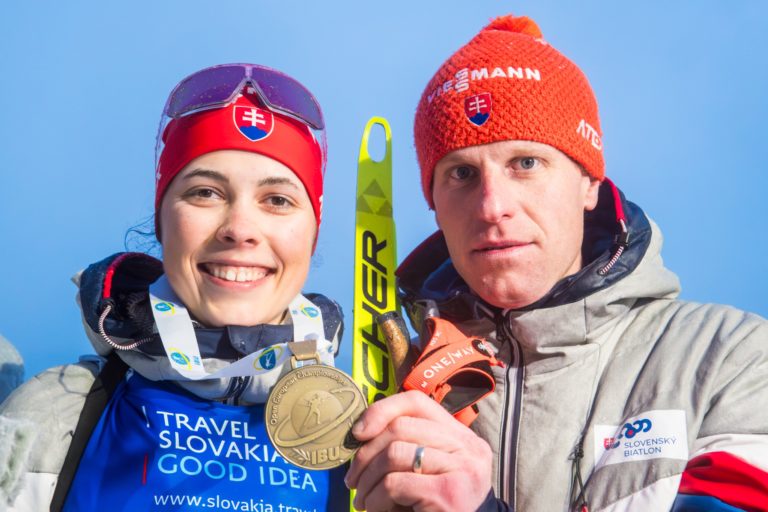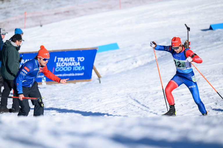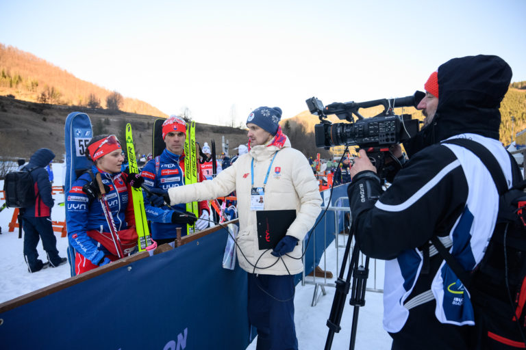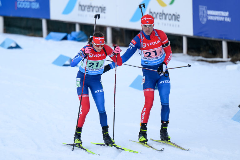 Zľava: Slovenská biatlonistka Zuzana Remeňová a slovenský biatlonista Matej Kazár počas miešanej štafety jednotlivcov v rámci majstrovstiev Európy v biatlone 2024 v Osrblí. Brezno-Osrblie, 28. január 2024. Foto: SITA/Slovenský biatlon/Soňa Niková