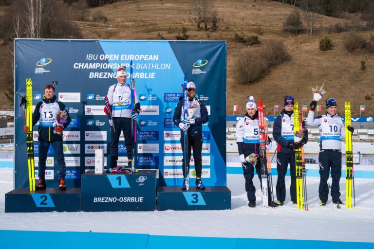 Zľava: Rumunský biatlonista Dmitrij Šamajev (2. miesto), nórsky biatlonista Isak Frey (1. miesto) a francúzsky biatlonista Antonin Guigonnat (3. miesto) po skončení stíhacích pretekov mužov na 12,5 km v rámci majstrovstiev Európy v biatlone 2024 v Osrblí. Brezno-Osrblie, 27. január 2024. Foto: SITA/Slovenský biatlon/Soňa Niková