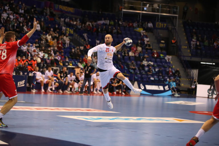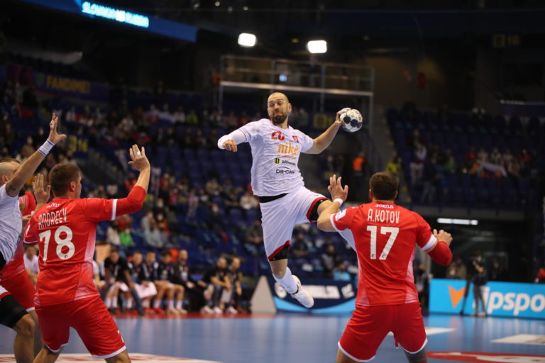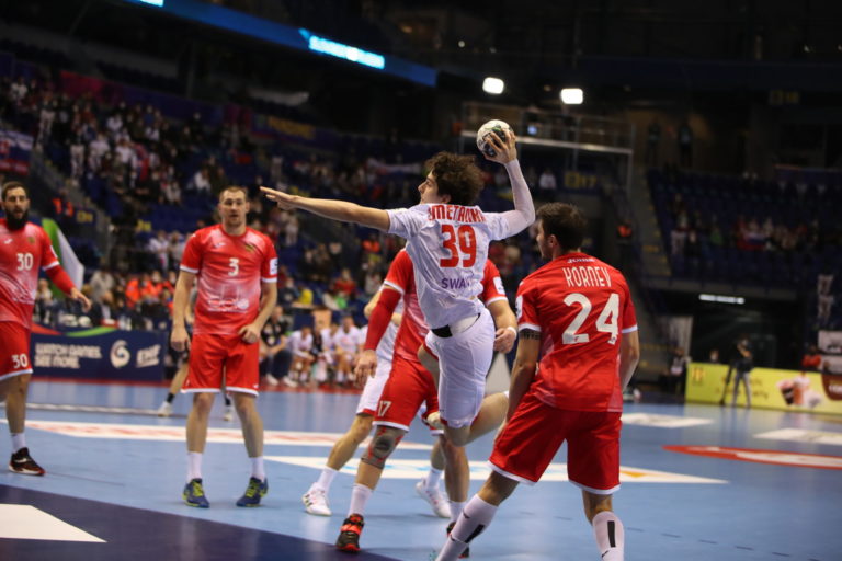 Patrik Hruščák zo Slovenska (uprostred) počas zápasu základnej F - skupiny na majstrovstvách Európy (ME) v hádzanej mužov EHF EURO 2022 medzi Slovensko - Rusko v Košiciach. Košice, 17. január 2022. Foto: SITA/Marek Lukáč