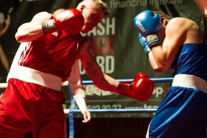 Tomáš Vaňo (vpravo) a Patrik Rajcsányi (vľavo) vo váhovej kategórii do 64 kg počas Majstrovstiev Slovenska mužov v boxe. Nitra 11. november 2012. Foto: SITA/Martin Havran