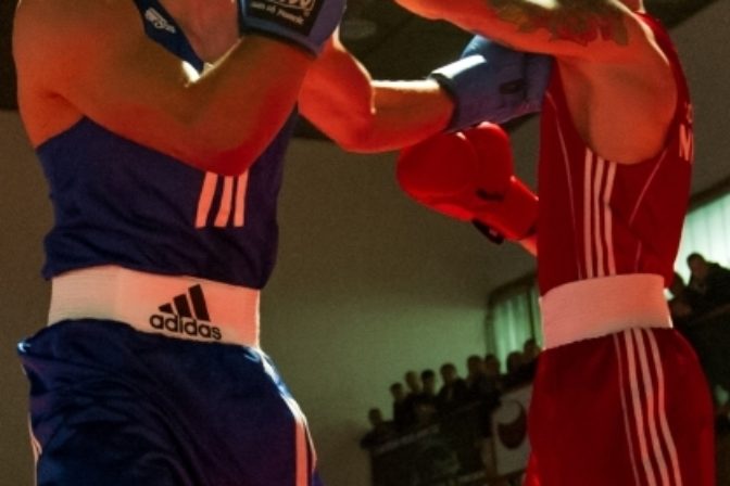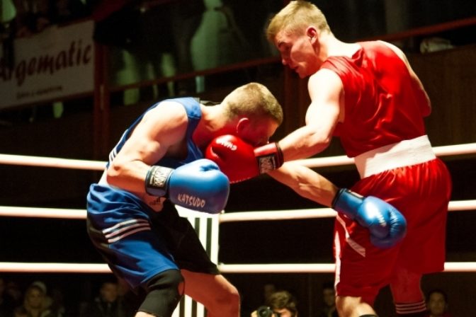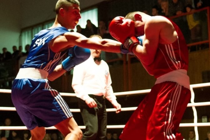 David Zold (vpravo) a Michal Zátorský (vľavo) vo váhovej kategórii do 60 kg počas Majstrovstiev Slovenska mužov v boxe. Nitra 11. november 2012. Foto: SITA/Martin Havran