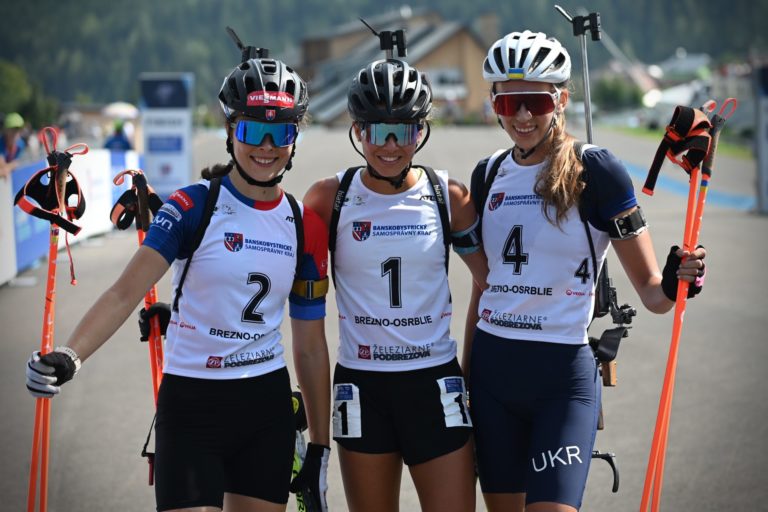 Zľava: Druhá v celkovom poradí Ema Kapustová zo Slovenska, prvá v celkovom poradí Lora Hristová z Bulharska a tretia v celkovoom poradí Olena Horodina z Ukrajiny v cieli stíhacích pretekov junioriek na 7,5 km v rámci Majstrovstiev sveta v letnom biatlone v Národnom biatlonovom centre Osrblie. Osrblie-Brezno, 27. august 2023. Foto: SITA/Jakub Julény