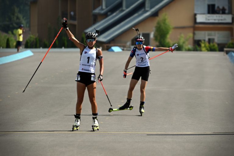 Sprava: Druhá v celkovom poradí Ema Kapustová zo Slovenska a prvá v celkovom poradí Lora Hristová z Bulharska v cieli stíhacích pretekov junioriek na 7,5 km v rámci Majstrovstiev sveta v letnom biatlone v Národnom biatlonovom centre Osrblie. Osrblie-Brezno, 27. august 2023. Foto: SITA/Jakub Julény