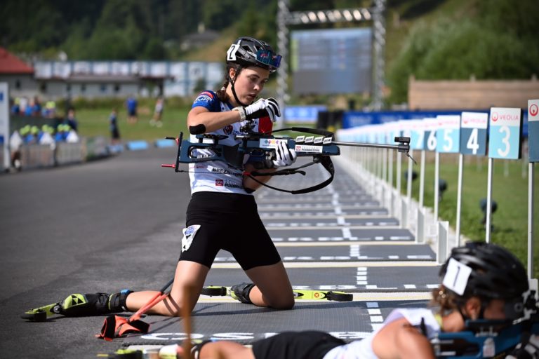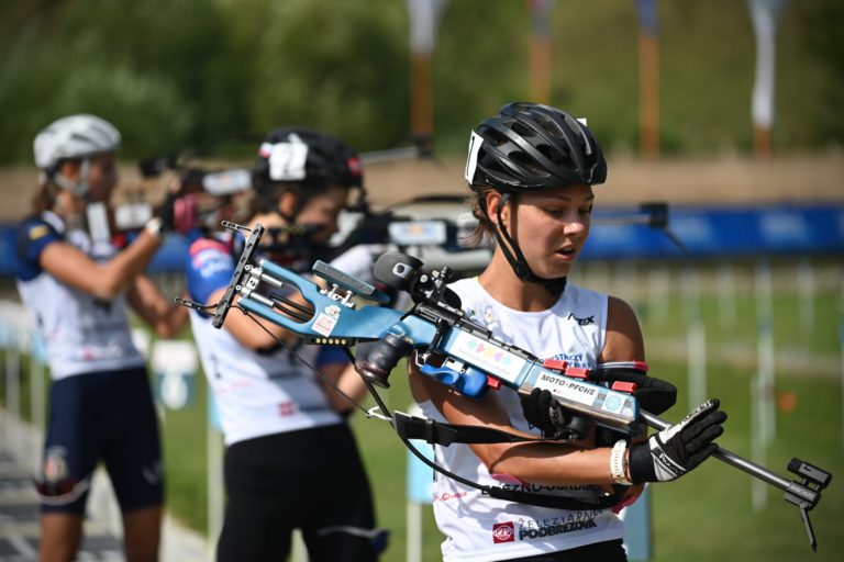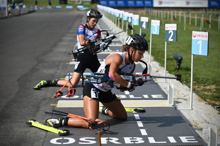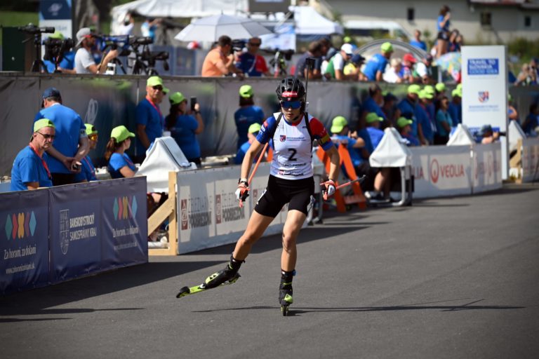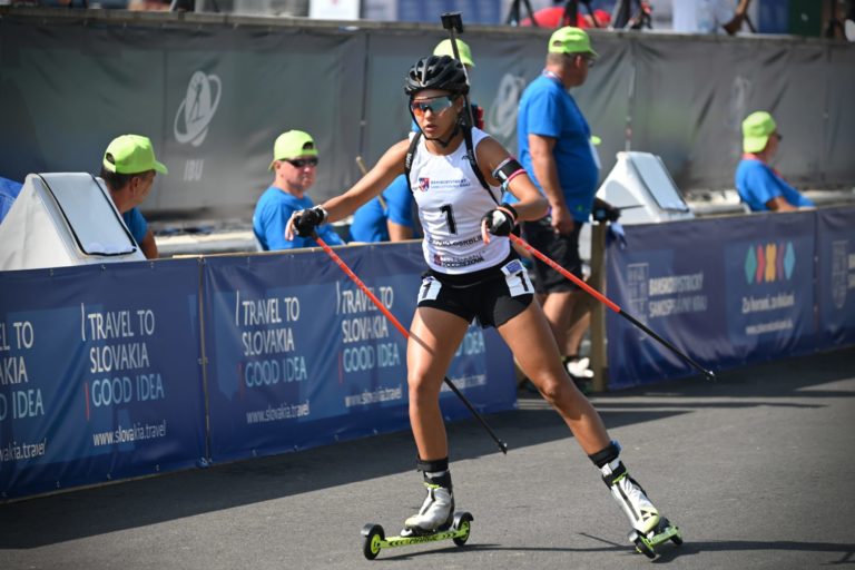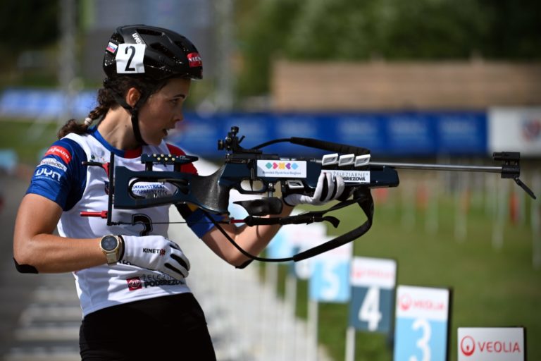 Druhá v celkovom poradí Ema Kapustová zo Slovenska počas stíhacích pretekov junioriek na 7,5 km v rámci Majstrovstiev sveta v letnom biatlone v Národnom biatlonovom centre Osrblie. Osrblie-Brezno, 27. august 2023. Foto: SITA/Jakub Julény