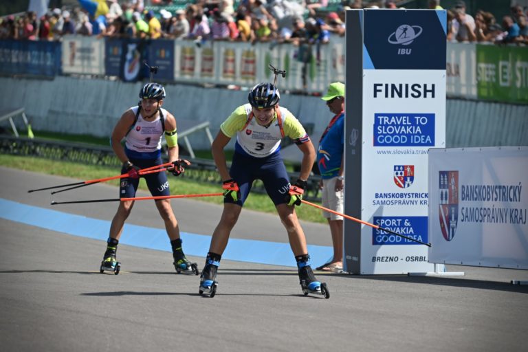 Zľava: Tretí v celkovom poradí Bohdan Borkovskij a druhý v celkovom poradí Vitalij Mandzyn z Ukrajiny počas stíhacích pretekov juniorov na 10 km v rámci Majstrovstiev sveta v letnom biatlone v Národnom biatlonovom centre Osrblie. Osrblie-Brezno, 27. august 2023. Foto: SITA/Jakub Julény