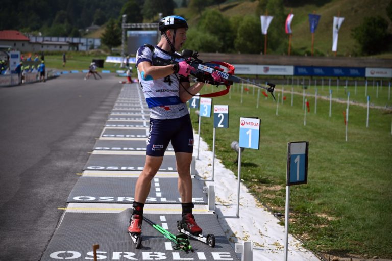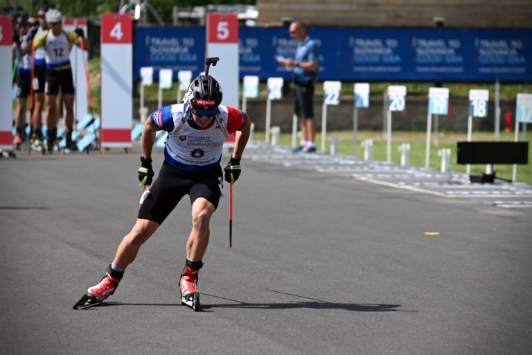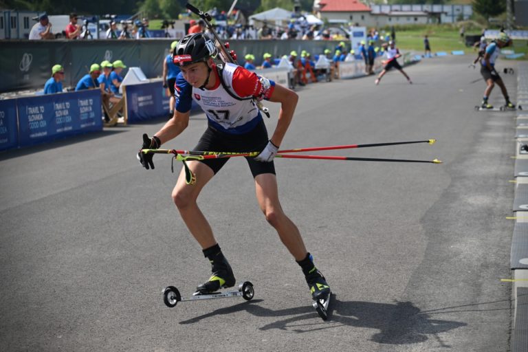 Piaty v celkovom poradí Jakub Borguľa zo Slovenska počas stíhacích pretekov juniorov na 10 km v rámci Majstrovstiev sveta v letnom biatlone v Národnom biatlonovom centre Osrblie. Osrblie-Brezno, 27. august 2023. Foto: SITA/Jakub Julény