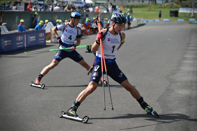 Zľava: Prvý v celkovom poradí Matija Legovič z Chorvátska a tretí v celkovom poradí Bohdan Borkovskij z Ukrajiny počas stíhacích pretekov juniorov na 10 km v rámci Majstrovstiev sveta v letnom biatlone v Národnom biatlonovom centre Osrblie. Osrblie-Brezno, 27. august 2023. Foto: SITA/Jakub Julény