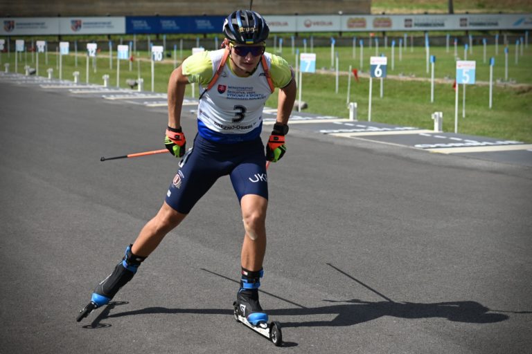 Druhý v celkovoom poradí Vitalij Mandzyn z Ukrajiny počas stíhacích pretekov juniorov na 10 km v rámci Majstrovstiev sveta v letnom biatlone v Národnom biatlonovom centre Osrblie. Osrblie-Brezno, 27. august 2023. Foto: SITA/Jakub Julény