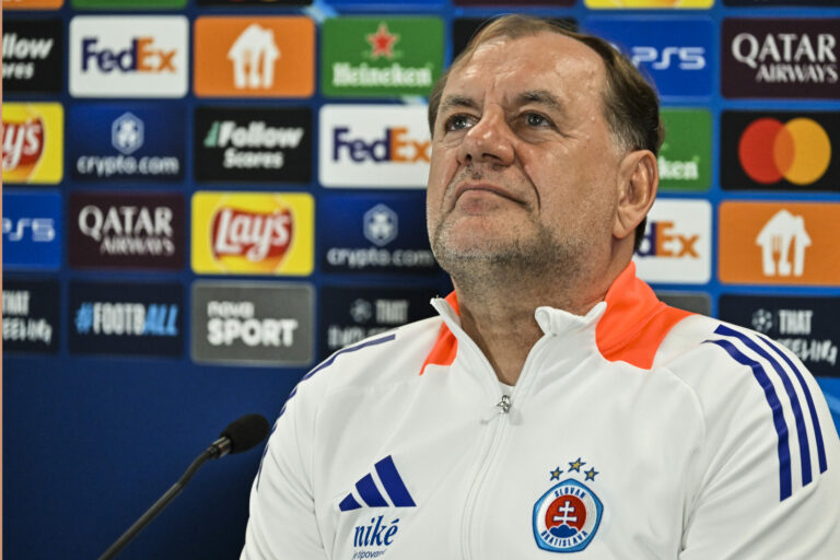 Tréner Vladimír Weiss počas tlačovej konferencie ŠK Slovan Bratislava pred zápasom Ligy majstrov UEFA 2024/25 medzi ŠK Slovan Bratislava – Manchester City v Národnom futbalovom centre v Bratislave. Bratislava, 30. september 2024. Foto: SITA/Milan Illík