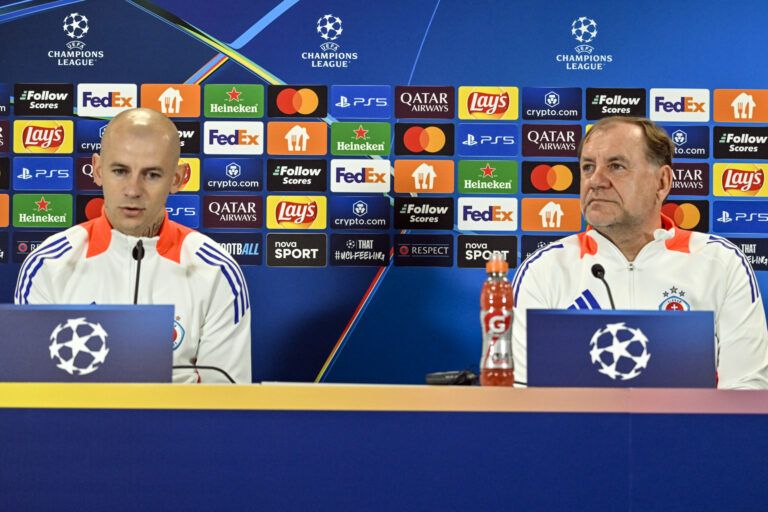 Sprava: Tréner Vladimír Weiss a futbalista Vladimír Weiss počas tlačovej konferencie ŠK Slovan Bratislava pred zápasom Ligy majstrov UEFA 2024/25 medzi ŠK Slovan Bratislava – Manchester City v Národnom futbalovom centre v Bratislave. Bratislava, 30. september 2024. Foto: SITA/Milan Illík