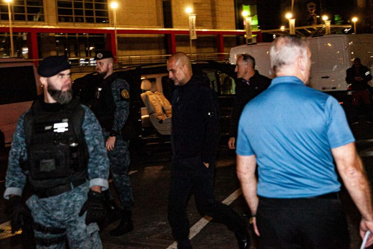 Tréner Manchester City FC Josep Guardiola (tretí zľava) počas príchodu členov futbalového klubu Manchester City FC do Bratislavy pred futbalovým zápasom Ligy majstrov 2024 s ŠK Slovan Bratislava, ktorý sa uskutoční na Národnom futbalovom štadióne Tehelné pole v Bratislave. Bratislava, 30. september 2024. Foto: SITA/ Bokor Tomáš