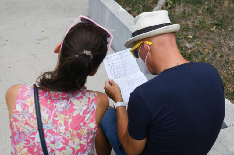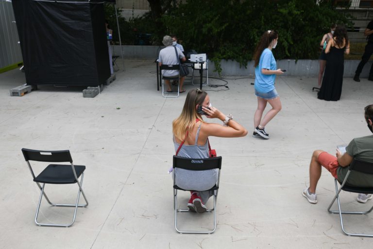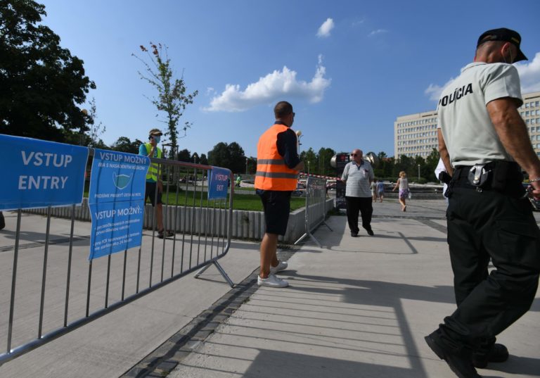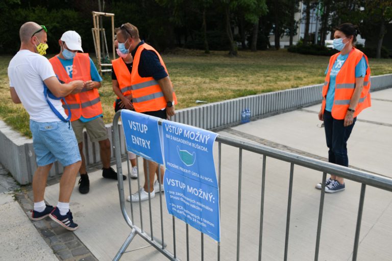 Atmosféra pri vstupe na verejnú manifestáciu s názvom Za očkované Slovensko, ktorú organizuje mimoparlamentná strana Progresívne Slovensko (PS) na Námestí slobody v Bratislave. Bratislava, 30. júl 2021. Foto: SITA/Martin Medňanský