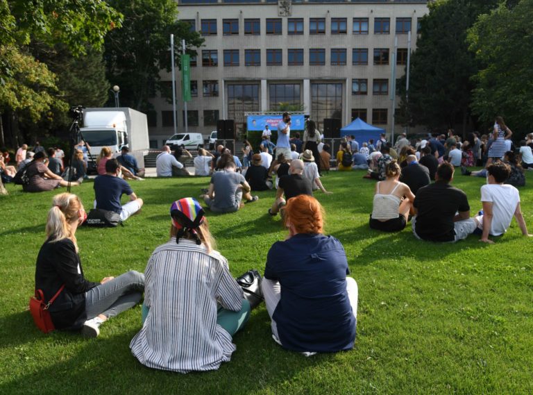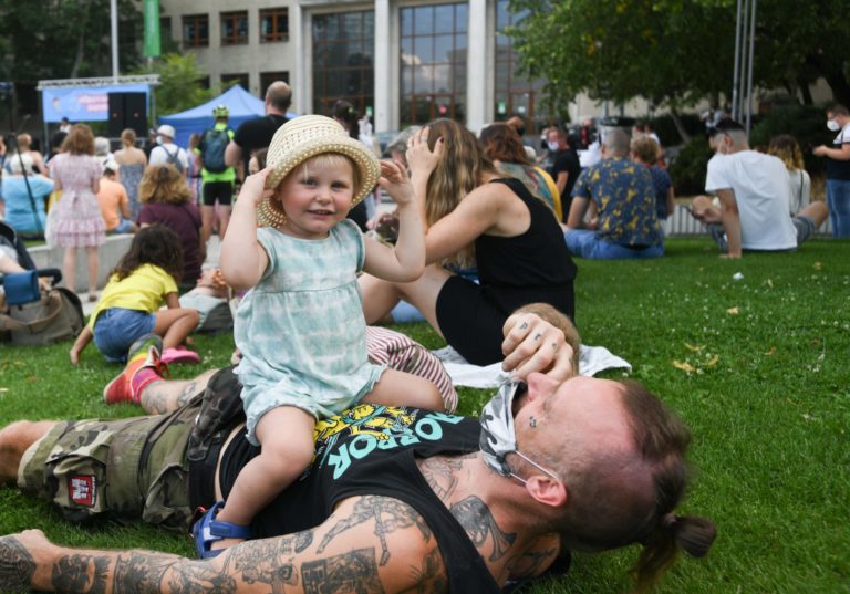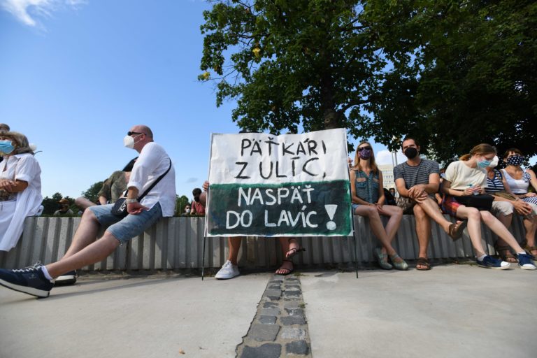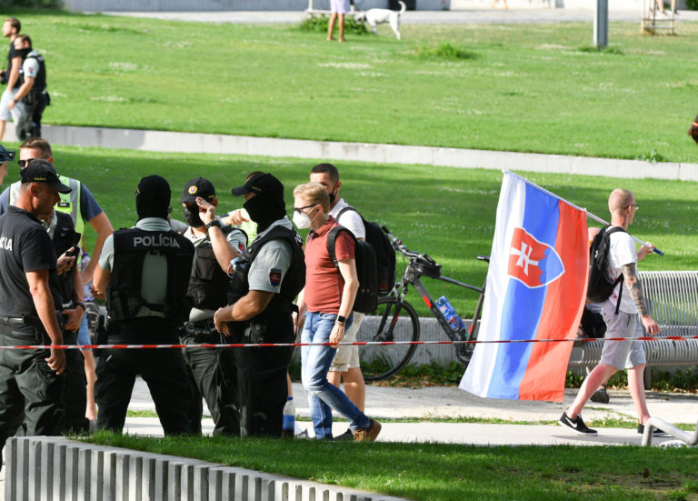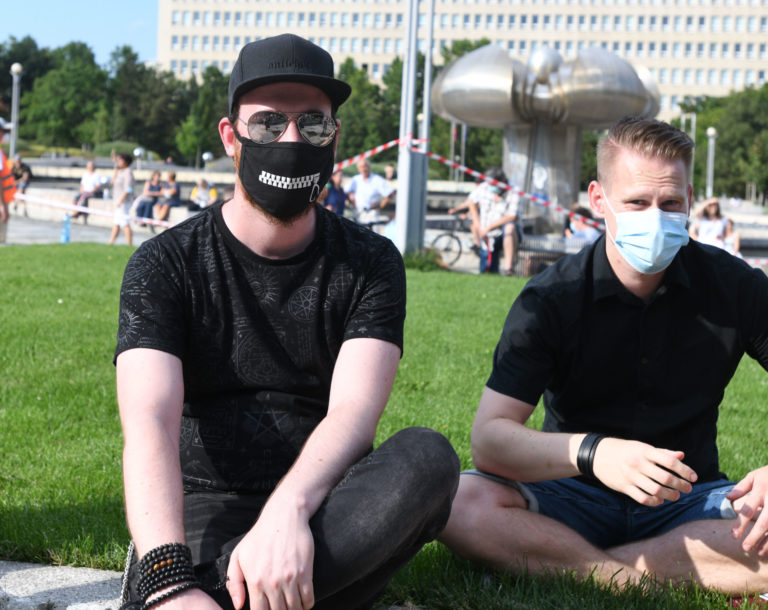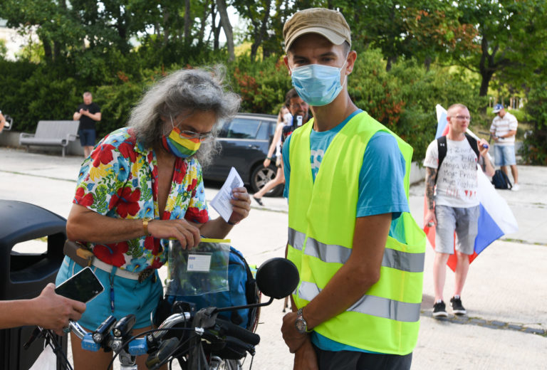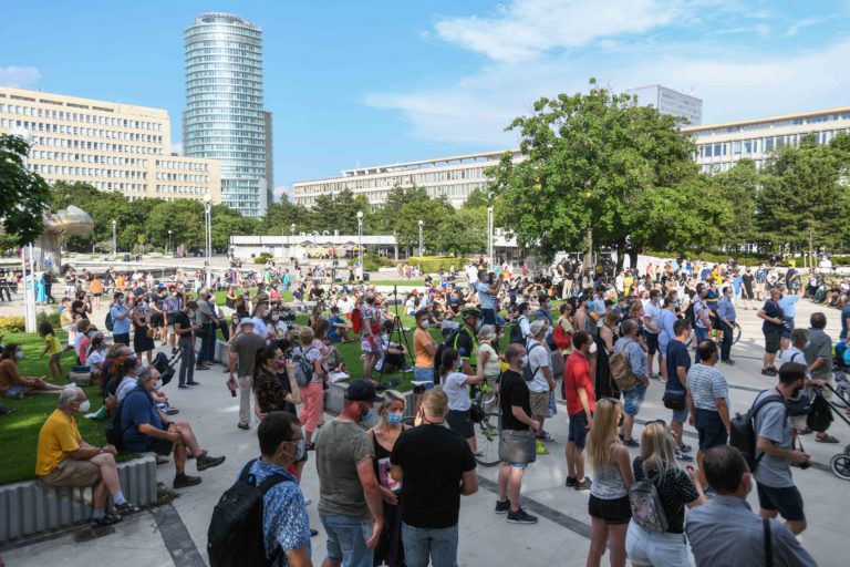 Atmosféra v okolí námestia počas verejnej manifestácie s názvom Za očkované Slovensko, ktorú organizuje mimoparlamentná strana Progresívne Slovensko (PS) na Námestí slobody v Bratislave. Bratislava, 30. júl 2021. Foto: SITA/Martin Medňanský