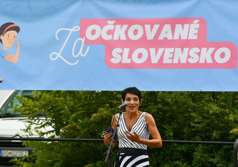 Ľudia čakajú na očkovanie vakcínou proti ochoreniu COVID-19 počas verejnej manifestácie s názvom Za očkované Slovensko, ktorú organizuje mimoparlamentná strana Progresívne Slovensko (PS) na Námestí slobody v Bratislave. Bratislava, 30. júl 2021. Foto: SITA/Martin Medňanský
