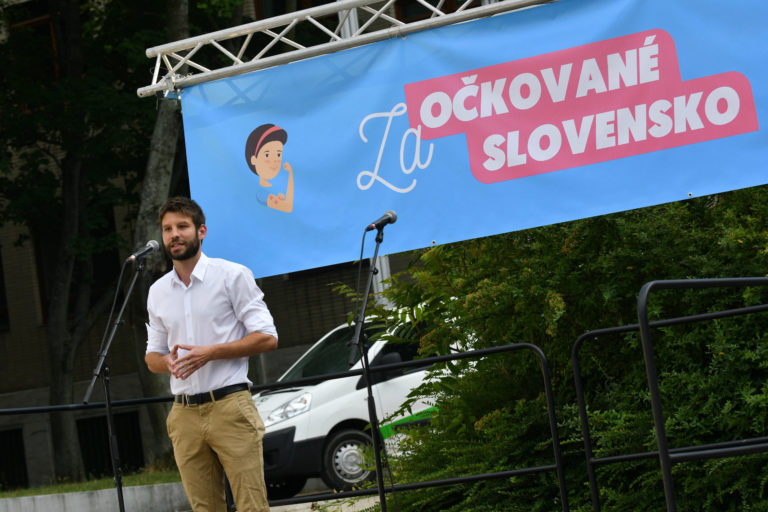 Poslanec Európskeho parlamentu Michal Šimečka počas verejnej manifestácie s názvom Za očkované Slovensko, ktorú organizuje mimoparlamentná strana Progresívne Slovensko (PS) na Námestí slobody v Bratislave. Bratislava, 30. júl 2021. Foto: SITA/Martin Medňanský