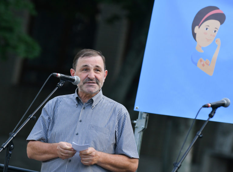 Evanjelický teológ Ondrej Prostredník počas verejnej manifestácie s názvom Za očkované Slovensko, ktorú organizuje mimoparlamentná strana Progresívne Slovensko (PS) na Námestí slobody v Bratislave. Bratislava, 30. júl 2021. Foto: SITA/Martin Medňanský