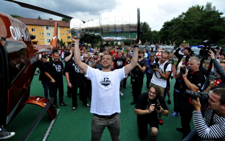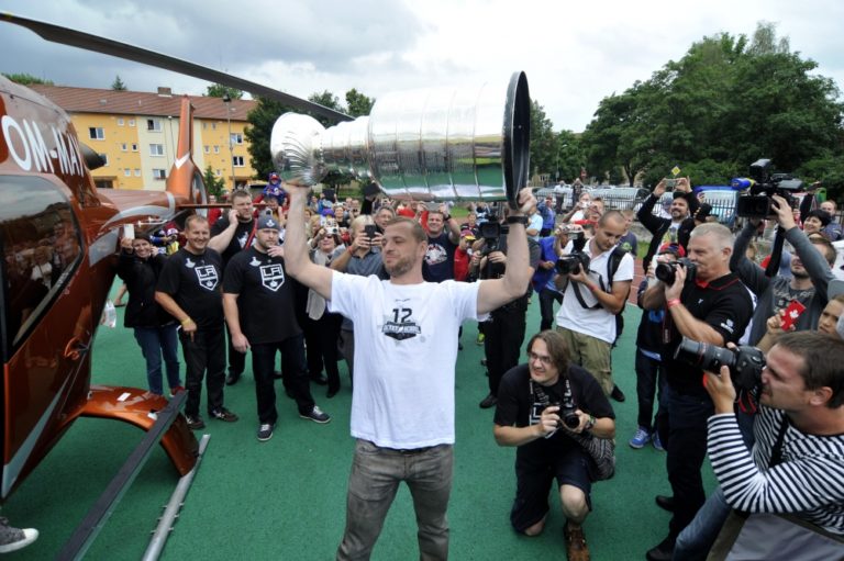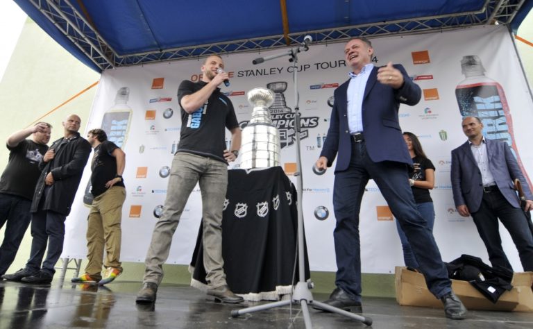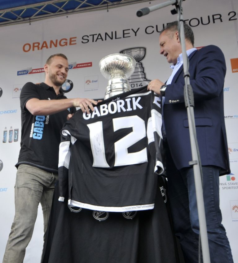 Slovenský hokejista a hráč víťazneho tímu NHL Los Angeles Kings v sezóne 2013/2014 Marián Gáborík (vľavo) počas oslavy a stretnutia s fanúšikmi pri príležitosti prezentácie prestížnej trofeje zámorskej hokejovej NHL - Stanleyho pohára na Slovensku. Trenčín, 11. júl 2014. Foto: SITA/Tomáš Somr