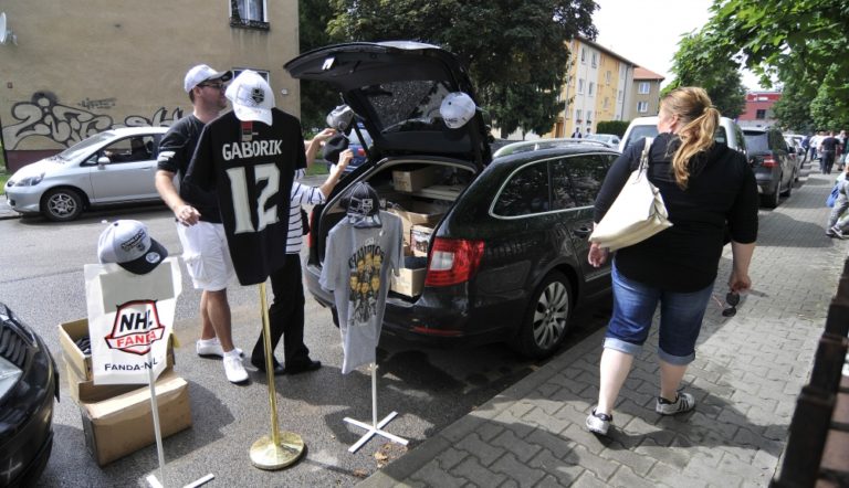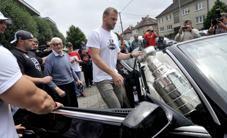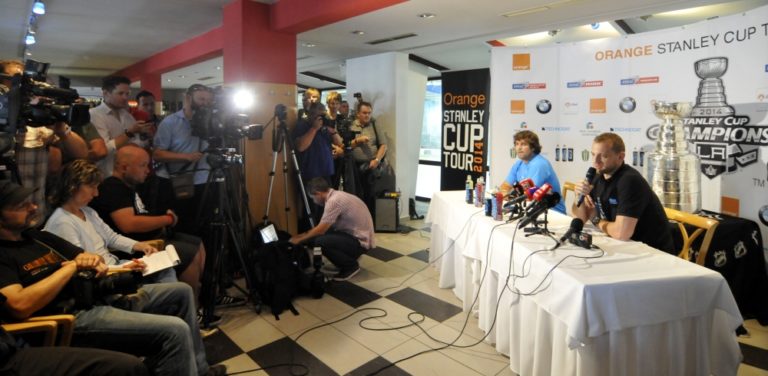 Slovenský hokejista a hráč víťazného tímu NHL Los Angeles Kings v sezóne 2013/2014 Marián Gáborík (v strede) pred TB a prezentáciou prestížnej trofeje zámorskej hokejovej NHL - Stanleyho pohára na Slovensku. Trenčín, 11. júl 2014. Foto: SITA/Tomáš Somr