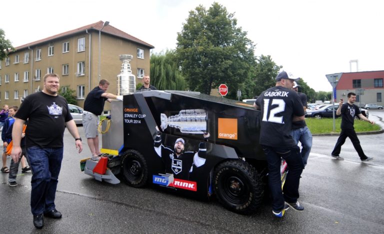 Slovenský hokejista a hráč víťazneho tímu NHL Los Angeles Kings v sezóne 2013/2014 Marián Gáborík (tretí zľava) nesie pohár na rolbe počas oslavy a stretnutia s fanúšikmi pri príležitosti prezentácie prestížnej trofeje zámorskej hokejovej NHL - Stanleyho pohára na Slovensku. Trenčín, 11. júl 2014. Foto: SITA/Tomáš Somr