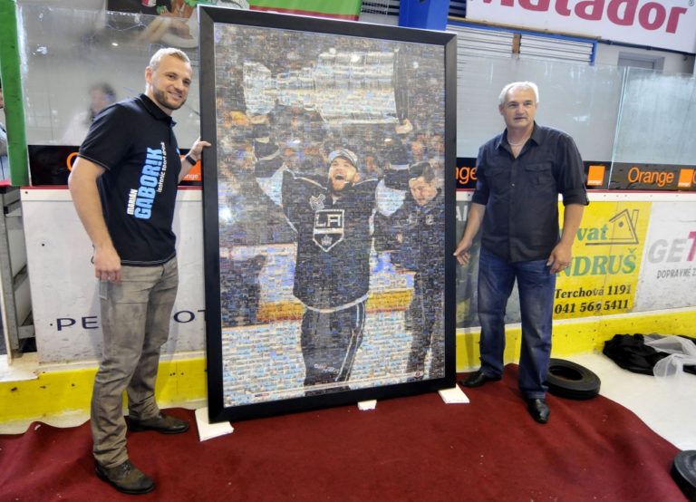 Slovenský hokejista a hráč víťazného tímu NHL Los Angeles Kings v sezóne 2013/2014 Marián Gáborík (vpravo) počas TB pri príležitosti prezentácie prestížnej trofeje zámorskej hokejovej NHL - Stanleyho pohára na Slovensku. Trenčín, 11. júl 2014. Foto: SITA/Tomáš Somr