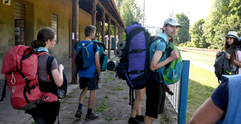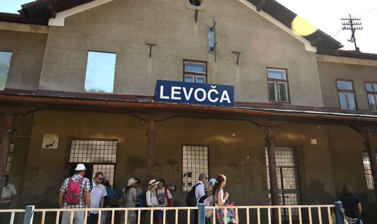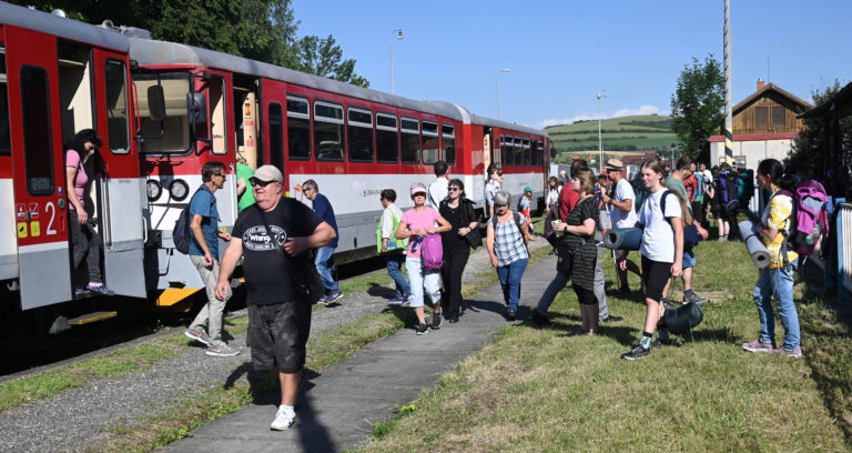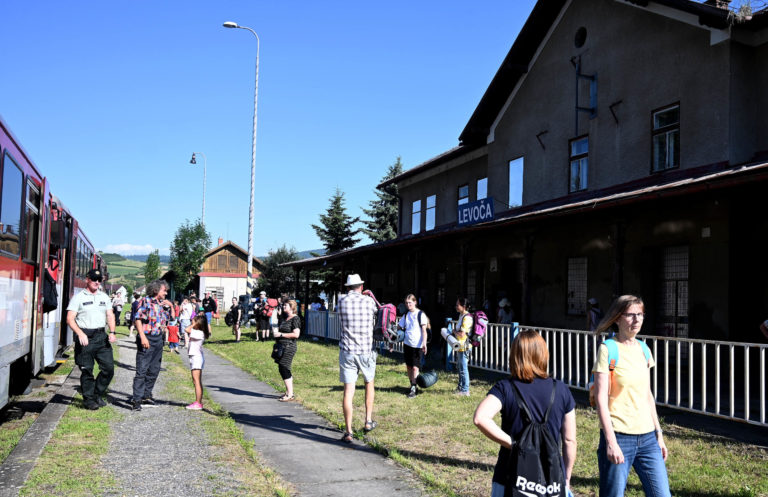 Veriaci počas príchodu na železničnú stanicu v Levoči vlakom, ktorý špeciálne vypravil národný dopravca Železničná spoločnosť Slovensko (ZSSK) zo Spišskej Novej Vsi do Levoče a späť pre pútnikov v rámci Levočskej púte. Levoča, 7. júl 2024. Foto: SITA/Viktor Zamborský