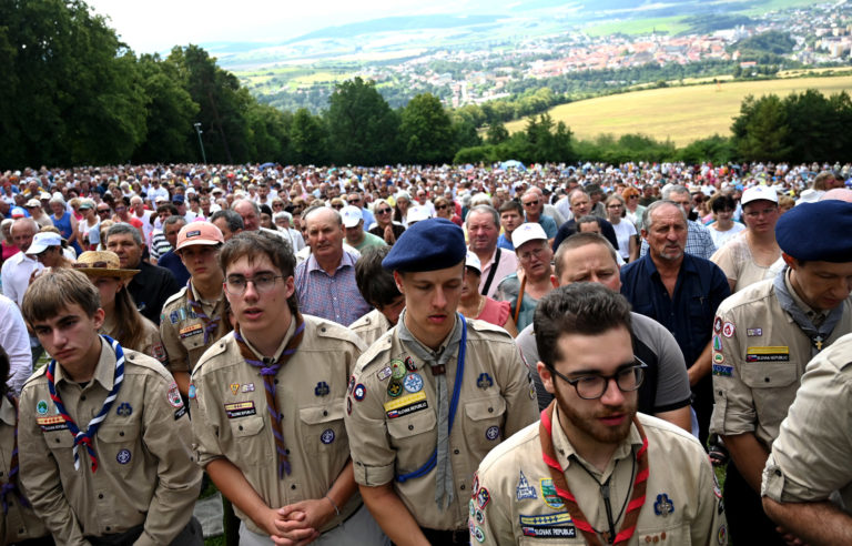 Skauti (v popredí) a veriaci pred začatím slávnostnej odpustovej svätej omše na Mariánskej hore pri príležitosti Levočskej púte. Levoča, 7. júl 2024. Foto: SITA/Viktor Zamborský