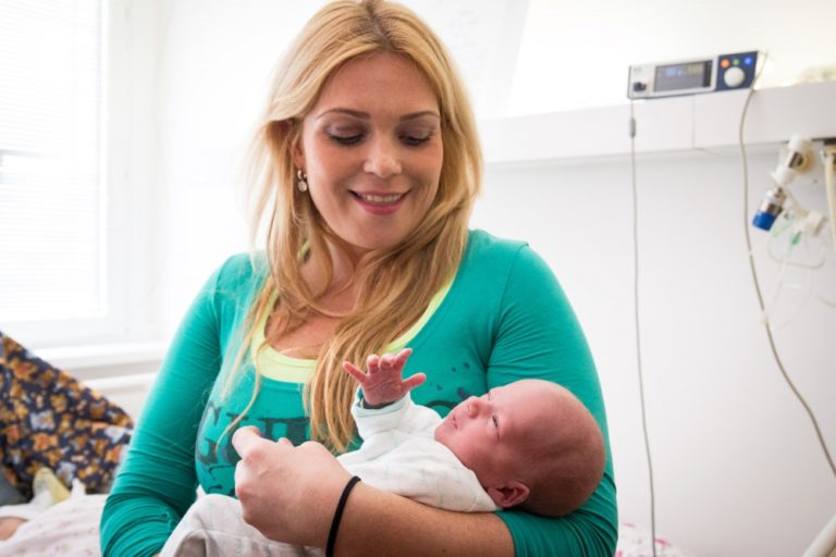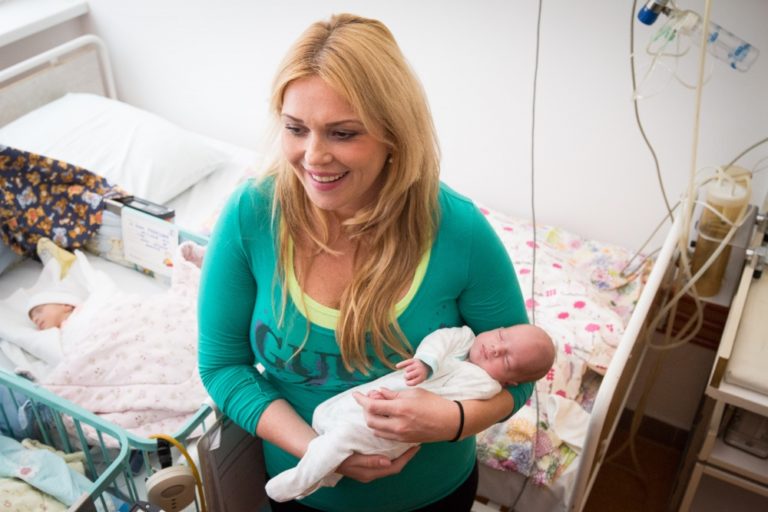 Mamička Petra a jedno z trojičiek, syn Daniel, počas fototermínu v Univerzitnej nemocnici Bratislava (UNB) - v Nemocnici sv. Cyrila a Metoda. Bratislava, 20. júl 2016. Foto: SITA/Marek Mrviš