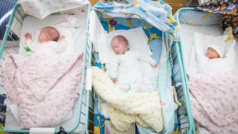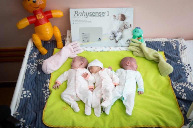 Zľava: Trojičky Anna, Zoja a Daniel počas fototermínu v Univerzitnej nemocnici Bratislava (UNB) - Nemocnici sv. Cyrila a Metoda. Bratislava, 20. júl 2016. Foto: SITA/Marek Mrviš