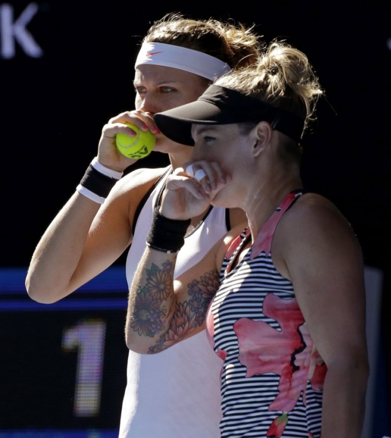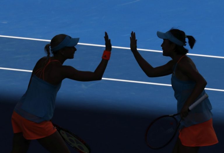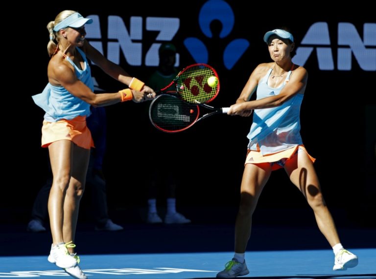 Česká tenistka Andrea Hlaváčková a Číňanka Šuaj Pcheng počas finálového zápasu ženskej štvorhry na Australian Open, v ktorom podľahli česko-americkej dvojici Bethanie Matteková-Sandsová, Lucie Šafářová 7:6 (4), 3:6, 3:6. Melbourne, 27. január 2017. Foto: SITA/AP