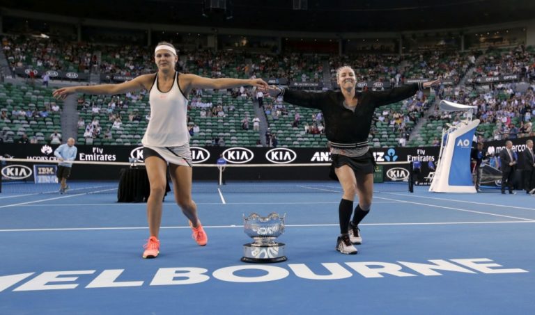 Česká tenistka Lucie Šafářová a Američanka Bethanie Matteková-Sandsová po finálovom zápase ženskej štvorhry na Australian Open, v ktorom zdolali česko-čínsky pár Andrea Hlaváčková, Šuaj Pcheng 6:7 (4), 6:3, 6:3. Melbourne, 27. január 2017. Foto: SITA/AP