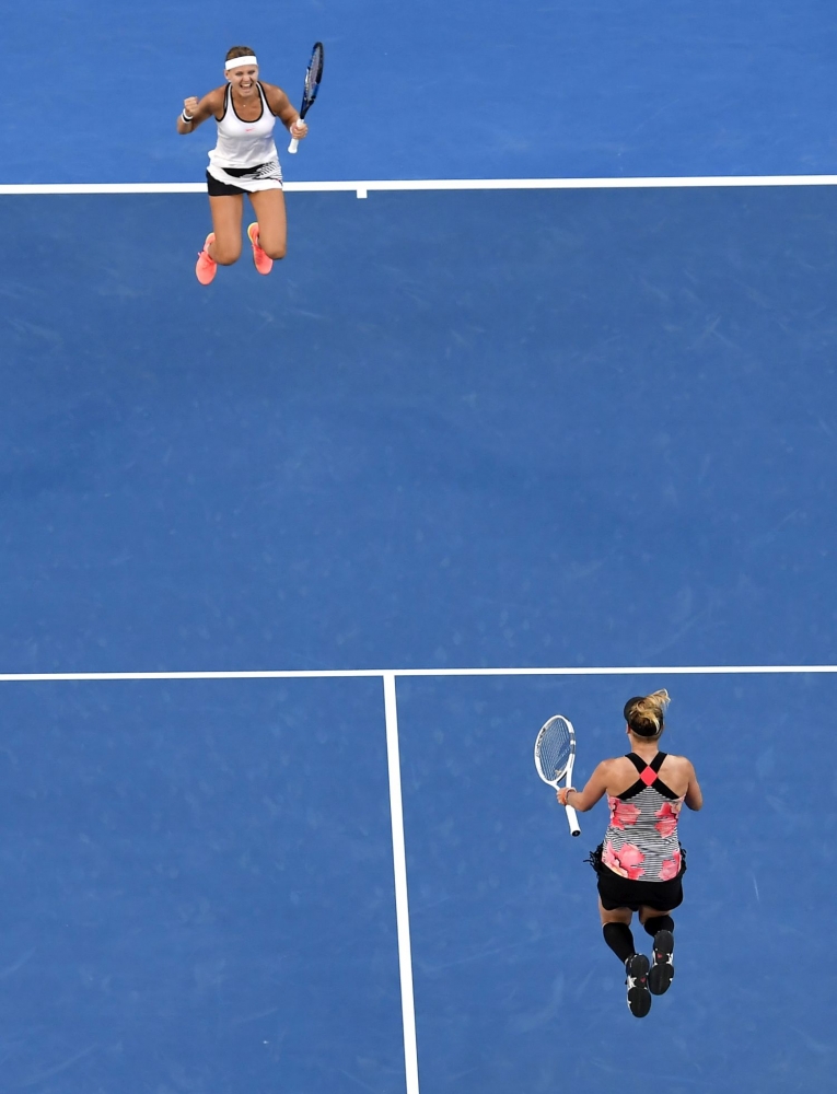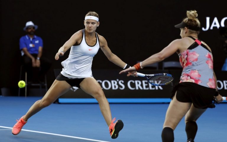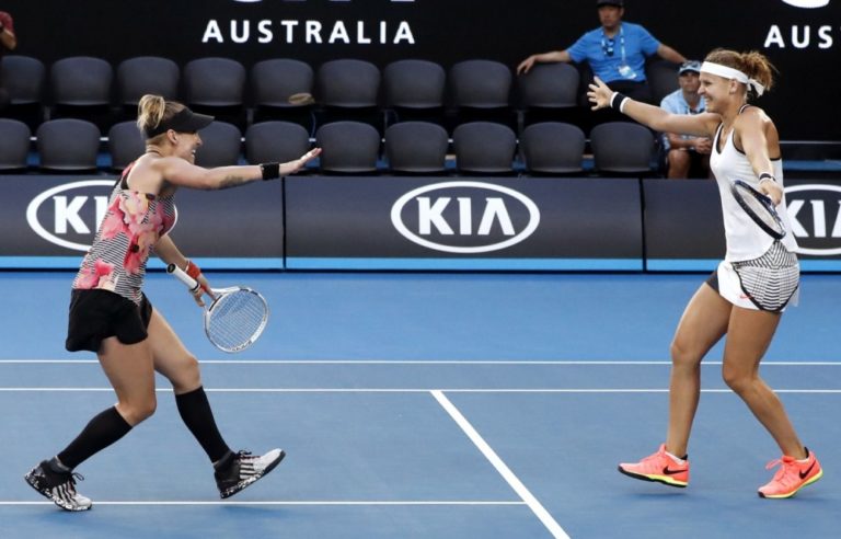 Česká tenistka Lucie Šafářová a Američanka Bethanie Matteková-Sandsová počas finálového zápasu ženskej štvorhry na Australian Open, v ktorom zdolali česko-čínsky pár Andrea Hlaváčková, Šuaj Pcheng 6:7 (4), 6:3, 6:3. Melbourne, 27. január 2017. Foto: SITA/AP